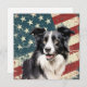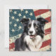 A watercolor portrait of a beautiful Border Collie Dog is placed against a grunge background of the USA flag. The back of this all occasion flat card has a text field for you to customize.