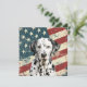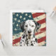 A watercolor portrait of a beautiful white Dalmatian Dog is placed against a grunge background of the USA flag. The back of this all occasion flat card has a text field for you to customize.