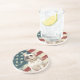 On this sandstone coaster, a watercolor portrait of a white French Bulldog is placed against a grunge background of the USA flag. Perfect for any patriot who loves a Frenchie!