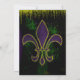 Grunge-style Mardi Gras design with fleur-de-lis, splatters, and splotches, and drips in purple, green, and yellow.