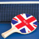 A fun table tennis / ping pong bat decorated on one side with the red, white and blue of the Union Jack, the flag of the United Kingdom. The Union Jack has been designed with 'fuzzy' edges to its lines, for a more casual look, and can be personalised with your initials or monogram.  The reverse side of the bat is black.