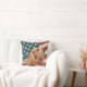 A beautiful watercolor portrait of a buff coloured Cocker Spaniel dog is placed against a grunge background of the USA flag. Both sides of the pillow have the same image.