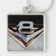 V-8, heavy 8 cylinder engines that were the gas guzzling powerhouses of classic muscle cars and hotrods. Close up photograph of the chrome decal emblem on the front hood, grunged up and digitised as art for the serious hardcore motorhead!