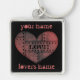 Cute key chain with a grungy heart to look like weathered metal sheets riveted together in faded red and grey tones on a black background with the word "Love" on it. You can place yours and your significant others' names on it or another text.