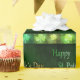 A St. Patrick's Day illustration: 4 different shamrock shapes and "Happy St. Patrick´s Day" letters in the irish flag colors on a grungy green background.