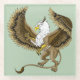 A brown and white fantasy gryphon is in flight ion a backdrop of sage green