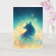 A majestic black wolf sits peacefully in a glowing meadow, bathed in the golden hues of twilight. The silhouette of the wolf is softly illuminated by the surrounding warm light, blending seamlessly into a dreamlike landscape filled with delicate flowers and fluttering butterflies. The background is a mesmerising blend of deep blues and glowing golds, evoking a sense of serenity, wonder, and mystery. The wolf’s expression is calm and reflective, as if deeply connected to nature’s energy. This enchanting scene captures the essence of magic, tranquillity, and the untamed spirit of the wilderness.