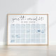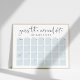 Let guests take their best guess at baby's arrival date with this customisable poster for your baby shower. Modern minimalist design features "guess the arrival date of baby [Name]" at the top, with four weeks of date boxes in soft pale blue for guests to write in their guesses. Use the template fields to number your dates to make this poster work for any month(s), and move the due date around if needed by accessing the design tool beneath the text templates.