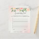 This baby shower game card features beautiful soft pastel watercolor roses and peonies in shades of blush pink and peach with lush green botanical leaves and eucalyptus.
