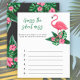 Baby shower invitation design features pink flamingo with lush green palm leaf fronds and tropical hibiscus flowers. "Aloha Baby". A tropical floral pattern with black background colour dresses up the back of the card.