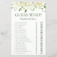 This Guess Who? Shower Game sheet will bring a lot of fun and laughter to your wedding shower! It challenges the guests to guess whether the bride or groom did something first in their relationship. The page is both elegant and charming. Its beautiful design with multi-hued white hydrangeas, delicate wisps of natural greenery in contemporary watercolor styling, and coordinating green stripes on the back is perfect for any boho, rustic, botanical, floral, garden, romantic, vintage or formal wedding. It's a perfect game for any type of bridal/couples shower. To make this game your own simply select Personalise this template and type in the names of the bride and groom.