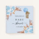 For an elegant and modern baby shower. A light blue background. Decorated with light blue, florals, pampas grass and a teddy bear holding a balloon.