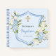 A light blue background. Decorated with a pink crest, blue and white flowers, florals. With a golden cross.