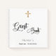 A white background colour, decorated with a golden cross. Add a name and a date. The text: Guest Book is written with a modern hand lettered style script.