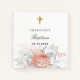 A chic white background with rose gold and white florals, silver foliage and a golden cross. Personalise and add a name, and date.