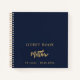 A guest book for a 50th (or any age) birthday party. A dark blue background. Add your name, age, date. The name is written with a modern hand lettered style script. Golden text.