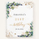 A white background colour. Decorated with eucalyptus greenery, golden foliage and faux gold glitter dust. Add a name, age and a date.