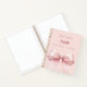 A blush pink background colour. Decorated with a large pink bow. Personalise and add your name, text.
