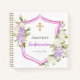 A white background. Decorated with a pink crest, pink and purple flowers, florals. With a golden cross.