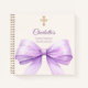 A cream, beige background colour. Decorated with a large lavender coloured bow and a golden cross. Personalise and add the name and date.