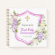 A white background. Decorated with a pink crest, pink and purple flowers, florals. With a golden cross.
