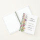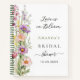 A white background colour. Decorated with wildflowers in pink, purple and yellow. Add a name and a date. Text: Love is in Bloom