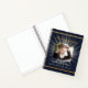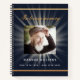 A guest book for a memorial service or funeral. A classic dark blue background, a faux gold frame on the front. Sun, star rays behind the photo. Personalise and add a photo, name and dates.