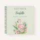 A trendy sage green background decorated with a pink flamingo and tropical flowers and foliage. Personalise and add a name and year.