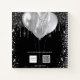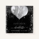 A stylish black background with faux silver glitter drips and dust. Decorated with purple balloons. Personalise and add a name, age and a date. The name is written with a modern hand lettered style script with swashes. To keep the swashes only delete the sample name, leave the spaces or emoji's in front and after the name.