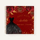 For a Quinceañera, 15th birthday party. A red background with faux gold glitter dust, a black dress and red roses, florals. The name is written with a modern hand lettered style script. Personalize and add a name and date.