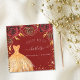For a Quinceañera, 15th birthday party. A red background with faux gold sparkles, a dress and red roses, florals. The name is written with a modern hand lettered style script. Personalize and add a name and date.
