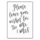 Please leave your wishes for the mr and mrs table top sign. Script graphic is printed on the front and back. Bottom space is left blank for your card holders.