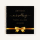 A stylish black background with a golden ribbon and bow. Personalise and add your names and wedding date.