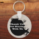 This promotional keychain features a torn and ripped paper design in light gray with "Thank You For Staying With Us" peeking out from underneath. The center is black with the text in pale gray. Text and black background color can easily be customized if you desire.