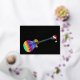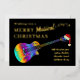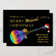 Bring some festive guitar music cheer to the christmas season with this fun merry musical christmas modern black and gold foil holiday card. Funny hand drawn bright rainbow colours semi acoustic electric guitar wearing a Santa hat illustration with gold foil musical notes and typography script all easy to personalise with the template. Ideal for music loving families to send seasons greetings and for guitar players, music teachers and musicians. Original artwork by Catherine Sweetman