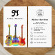 Guitar music teacher musicians business card with custom logo template and contact social media icon and details perfect for business networking. Groovy retro typography with easy to use templates and cool psychedelic acoustic guitar, semi acoustic guitar and electric guitar in bright colours on a white background complete with personalised monogram, name, address, website, mobile phone, email and social media details and your business logo. Cool colourful musicians business card design for guitarists, professional musicians, entertainers and music teachers. Original artwork by artist Catherine Sweetman