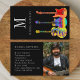 Stylish Guitar teacher custom photo business card. This vibrant business card features psychedelic acoustic, semi-acoustic, and electric guitars in a dazzling array of colours against a striking black background. Complete with a personalised photo, monogram, your name, contact details in all rendered in stylish typography, this card is the perfect cool and colourful introduction for guitar tutors, guitarists, professional musicians, entertainers, and music teachers. Original artwork by artist Catherine Sweetman.