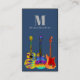 Modern guitar music teacher musicians business card with logo and website QR code. Psychedelic acoustic guitar, semi acoustic guitar and electric guitar in bright colours on a dark blue background complete with personalised monogram, name, details and QR code. The perfect cool colourful business card design for guitarists, professional musicians, entertainers and music teachers. Original artwork by artist Catherine Sweetman