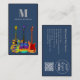Modern guitar music teacher musicians business card with logo and website QR code. Psychedelic acoustic guitar, semi acoustic guitar and electric guitar in bright colours on a dark blue background complete with personalised monogram, name, details and QR code. The perfect cool colourful business card design for guitarists, professional musicians, entertainers and music teachers. Original artwork by artist Catherine Sweetman