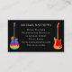 Modern Guitar teacher custom business card. This vibrant business card features psychedelic acoustic, semi-acoustic, and electric guitars in a dazzling array of colours against a striking black background. Complete with a personalised monogram, your name, contact details all rendered in stylish typography, this card is the perfect introduction for guitar tutors, guitarists, professional musicians, entertainers, and music teachers. Original artwork by artist Catherine Sweetman.
