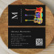 This vibrant business card features psychedelic acoustic, semi-acoustic, and electric guitars in a dazzling array of colours against a striking black background. Complete with a personalised monogram, your name, contact details, and a convenient website QR code, all rendered in stylish typography, this card is the perfect cool and colourful introduction for guitar teachers, guitarists, professional musicians, entertainers, and music teachers. Original artwork by artist Catherine Sweetman.