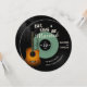 An elegant, music themed, guitar themed wedding invitation template in the shape of a vinyl record, that features an acoustic guitar, a fragment of a partition and the title "Eat, Sing & Be Married". Black with a sage green centre and a classic, golden brown guitar.
