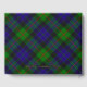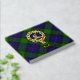 Clan Gunn crest badge surrounded by a strap and buckle over tartan background. Custom front, back and spine text.