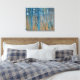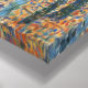 This is based on classic nature painting artworks by Gustav Klimt, Beech Grove 1, 1902. The artwork portrays a dense forest of tall, slender birch trees, with pale trunks marked by dark, vertical lines. The foliage is depicted in shades of blue, green, and yellow, adding a sense of depth and vibrancy to the scene. The forest floor is covered in a layer of orange and brown leaves, creating a striking contrast with the lighter tree trunks. The overall composition uses pointillist and impressionistic techniques, giving the image a lively, textured appearance. The verticality of the trees emphasises the serene and rhythmic structure of the forest.