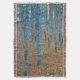 This is based on classic nature painting artworks by Gustav Klimt, Beech Grove 1, 1902. The artwork portrays a dense forest of tall, slender birch trees, with pale trunks marked by dark, vertical lines. The foliage is depicted in shades of blue, green, and yellow, adding a sense of depth and vibrancy to the scene. The forest floor is covered in a layer of orange and brown leaves, creating a striking contrast with the lighter tree trunks. The overall composition uses pointillist and impressionistic techniques, giving the image a lively, textured appearance. The verticality of the trees emphasises the serene and rhythmic structure of the forest.
