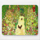 Mouse Pad featuring Gustav Klimt’s oil painting Garden with Roosters (1917). Two brown chickens stand on a garden path. Beautiful pink, red, and white flowers bloom along the path. A great gift for fans of Art Nouveau and Austrian art.