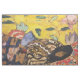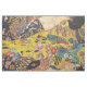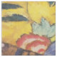 This half portrait of a beautiful woman shows a yellow background with asiatic ornaments, colourful birds and lotus flowers. The lady wears a dress in the style of a kimono imprinted with motives of a Chinese dragon dress.