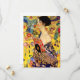 Card featuring Gustav Klimt’s oil painting Lady with Fan (1918). A woman wearing a blue kimono holds a red fan against a colourful yellow background of flowers and peacocks. A great gift for fans of Japonisme and European art.