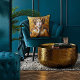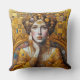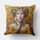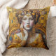 This throw pillow has a beautiful seated woman in an Art Nouveau, Gustav Klimt style image of rich golden yellow. Elegant, organic, and beautifully detailed — a masterpiece that elevates everyday life.