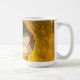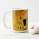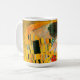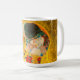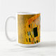 Coffee Mug featuring Gustav Klimt’s oil painting with gold leaf The Kiss (1908). A man and woman, wearing brilliant golden colours, lovingly embrace and kiss in a field of flowers. A great gift for fans of Art Nouveau and Austrian art.